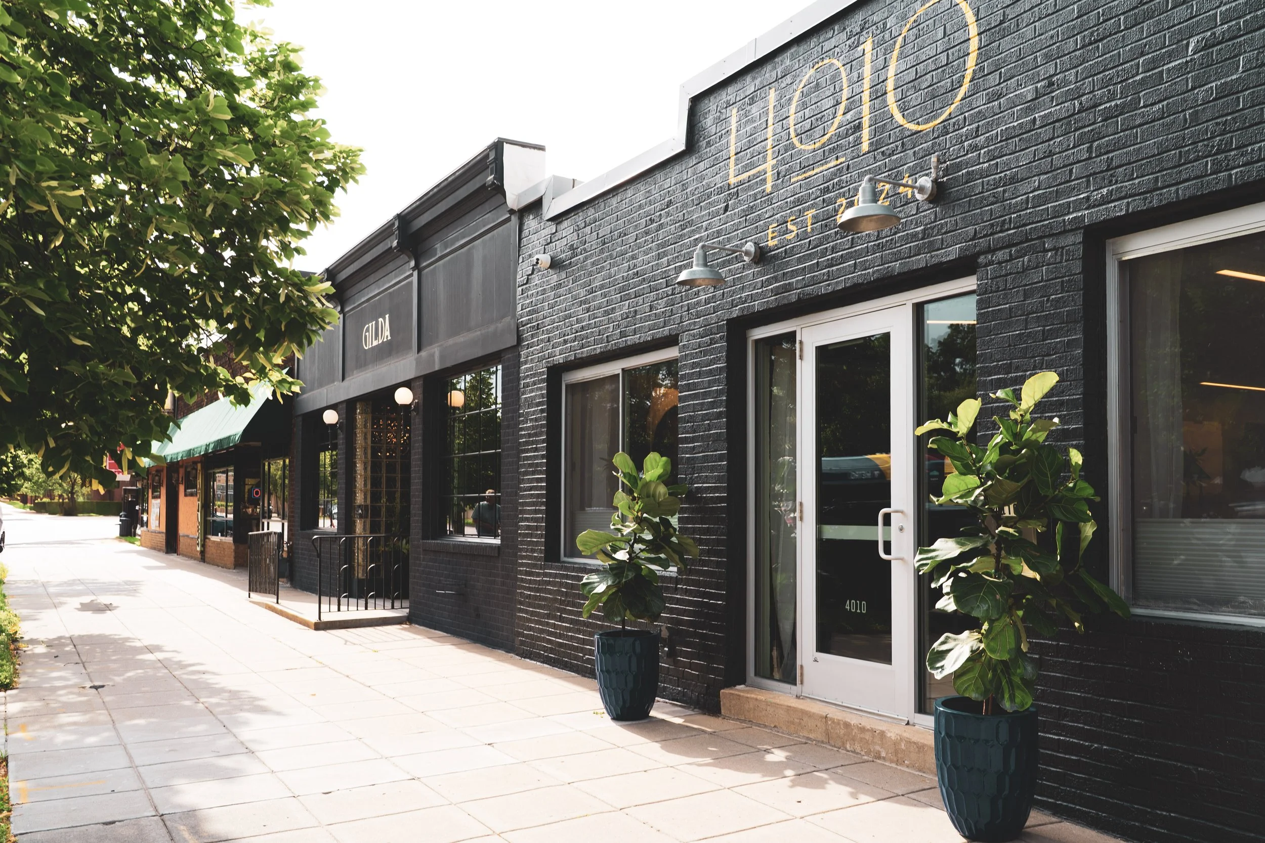 Sidewalk view of a row of small businesses, including Gilda, with black brick exteriors, potted plants, and trees providing shade.