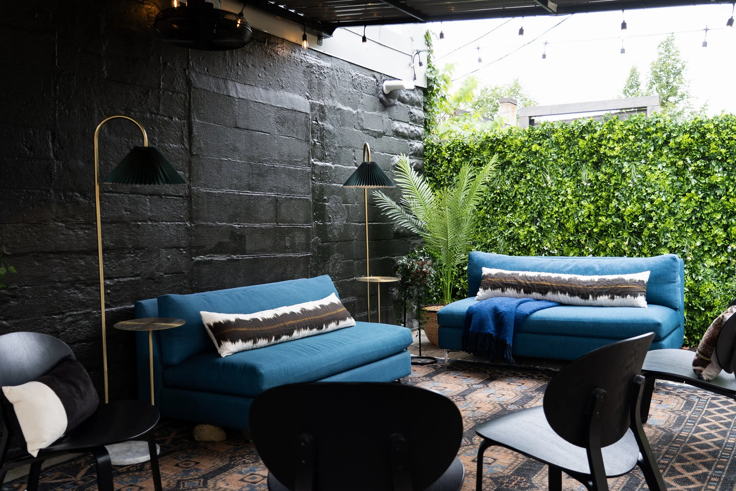 Cozy outdoor patio with blue couches, black chair, lush green plants, and string lights against a black brick wall.