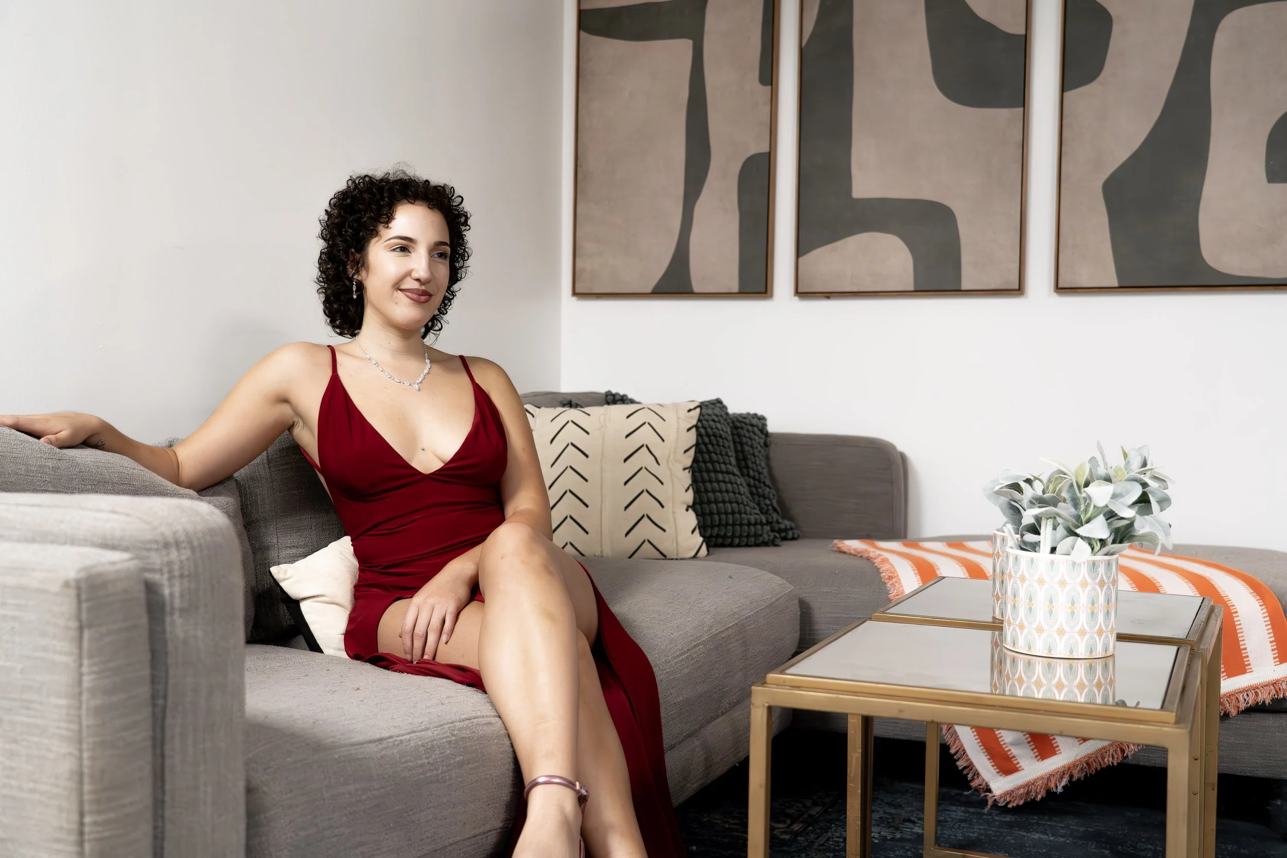 A woman with curly hair in a red dress sits on a gray sectional sofa in a modern living room, smiling gently. There are decorative pillows behind her and abstract art on the wall. A small table with a potted plant and a striped throw blanket are in t