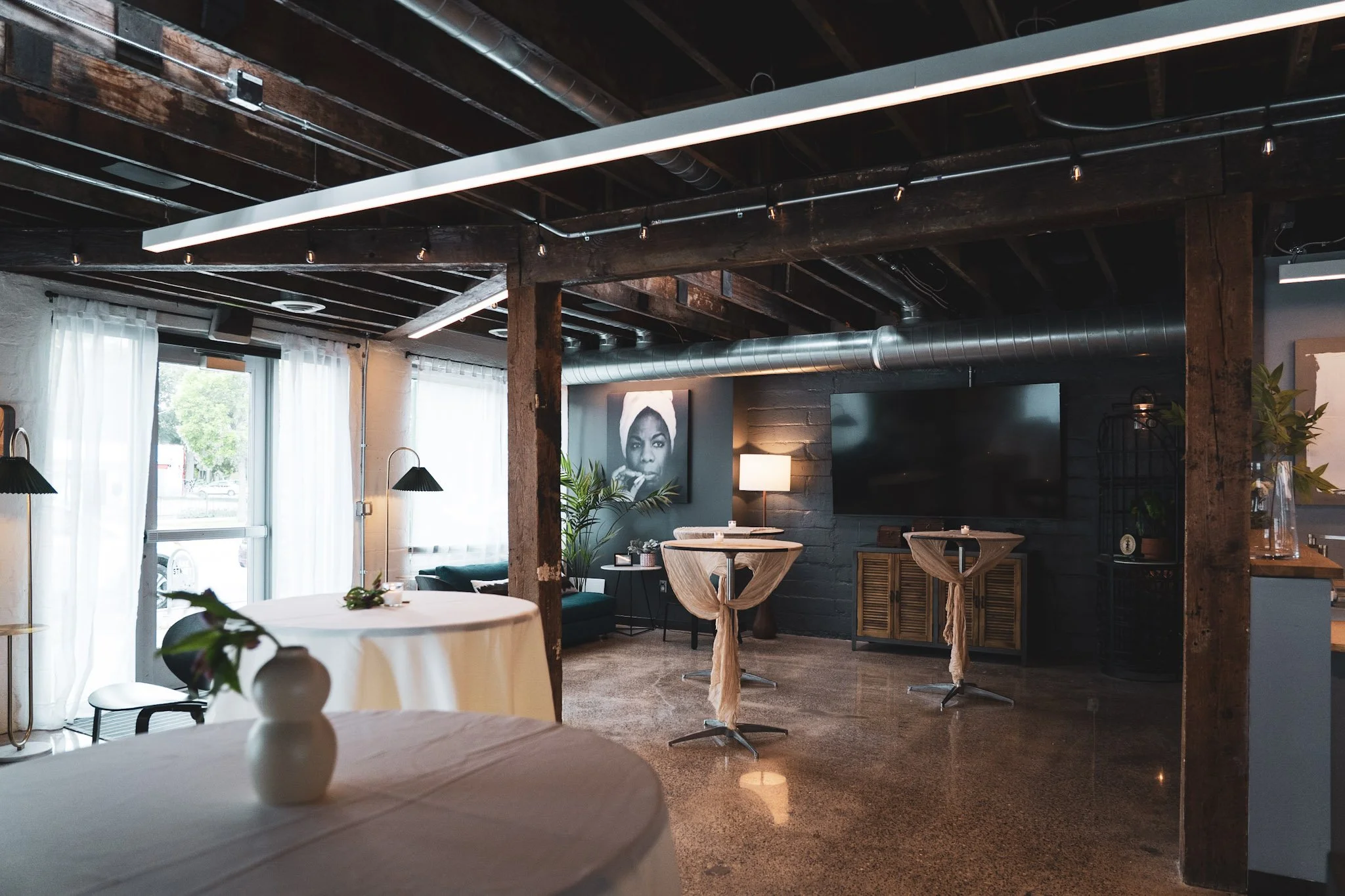 Interior of a modern event space with three high-top tables covered with white tablecloths, a blue sofa near windows with sheer curtains, a large abstract painting, and various plants, with natural light coming through glass doors and windows.