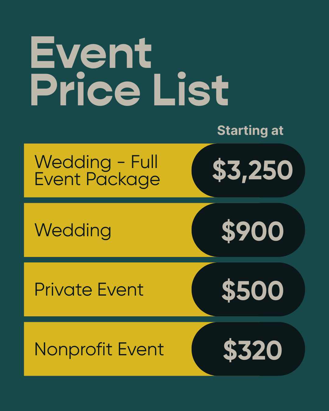 * Our Wedding Full Event Package includes: Wedding shower, Bridal shower, All-day access for setup, ceremony, reception, and teardown.